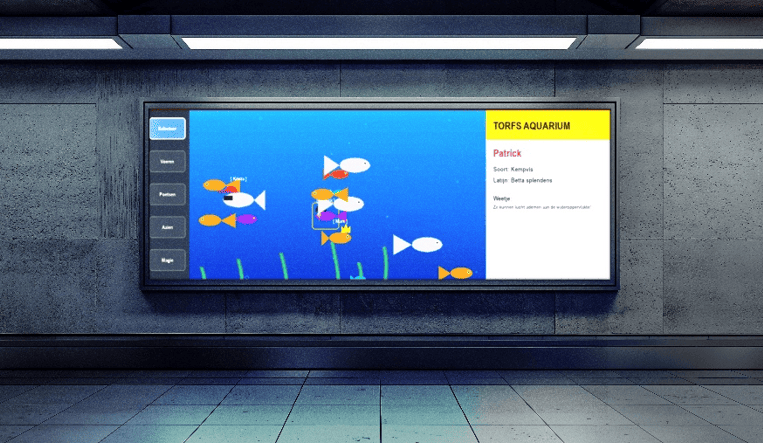 Een interactief digitaal aquarium voor de kinderhoek van Torfs-winkels. Via een touchscreen zorgen kinderen voor hun eigen virtuele vissen — aaien, voeren en namen geven. Wachten tijdens het schoenenpassen wordt zo een echte belevenis.