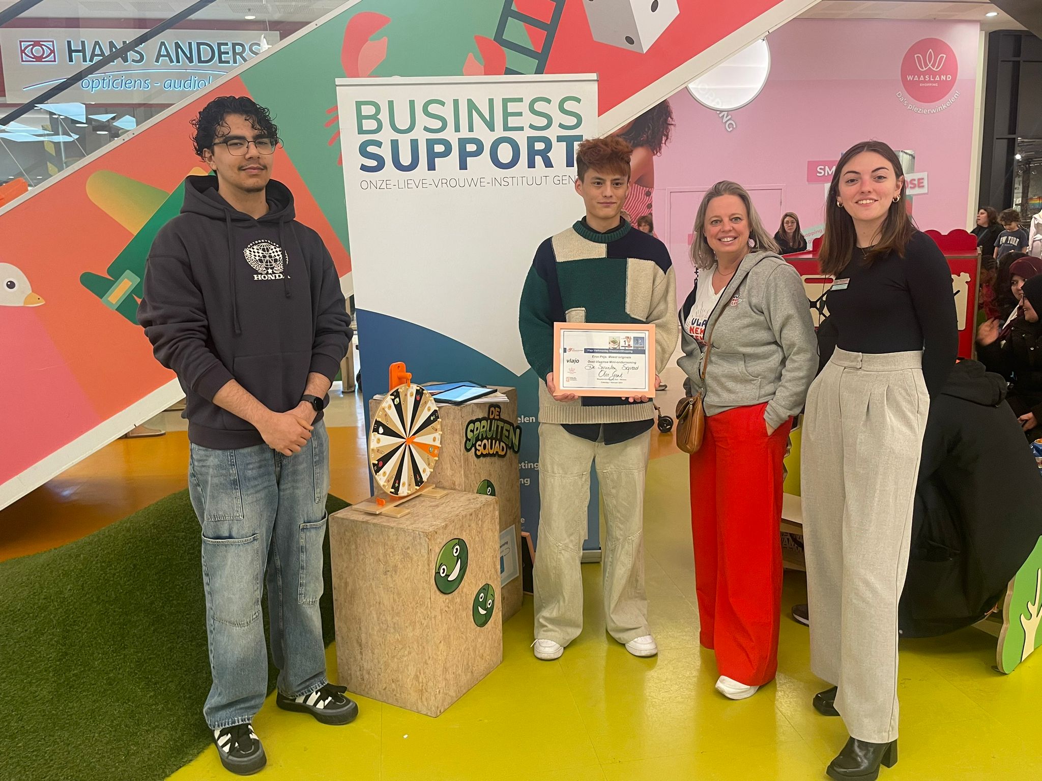 Op een cruciaal moment kwamen onze coördinator en Vlajo langs, net toen twee vlotte klasgenoten hun shift draaiden. Dit gaf een positieve impuls aan ons verkoopmoment en hielp ons om de prijs voor de meest originele mini-onderneming te winnen.