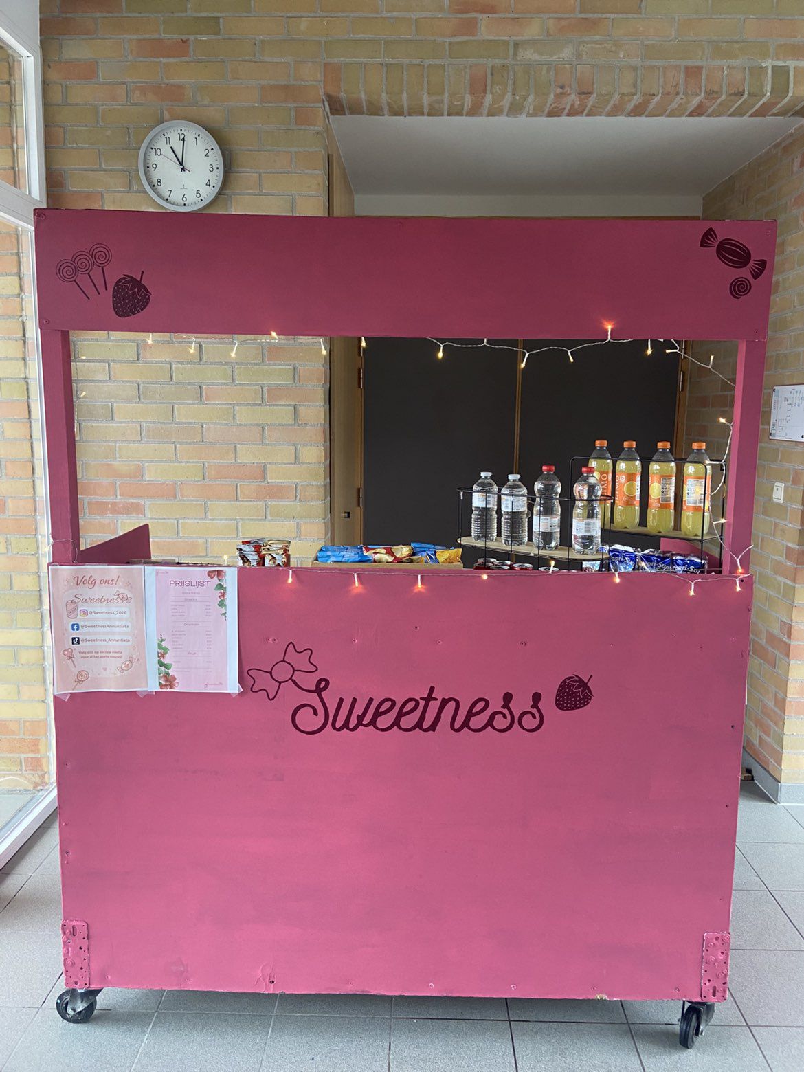 Onze verkoopstand is een kar en is gelinkt aan onze huisstijl. De kar is roze zoals ons logo. We hebben de kar versiert met lichtjes en ons logo ook. we hebben opbergruimte in de kar die we kunnen afsluiten. Op de kar staan dan onze producten in mandjes en rekjes gepresenteerd.