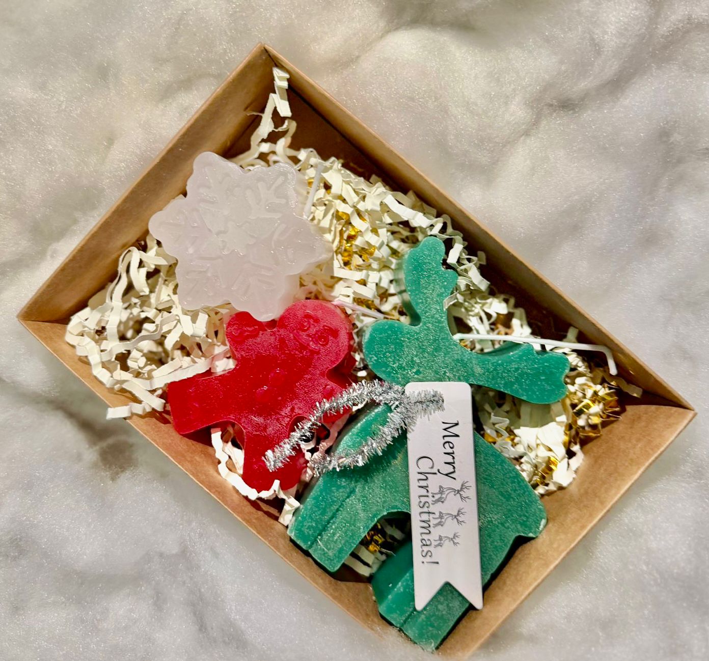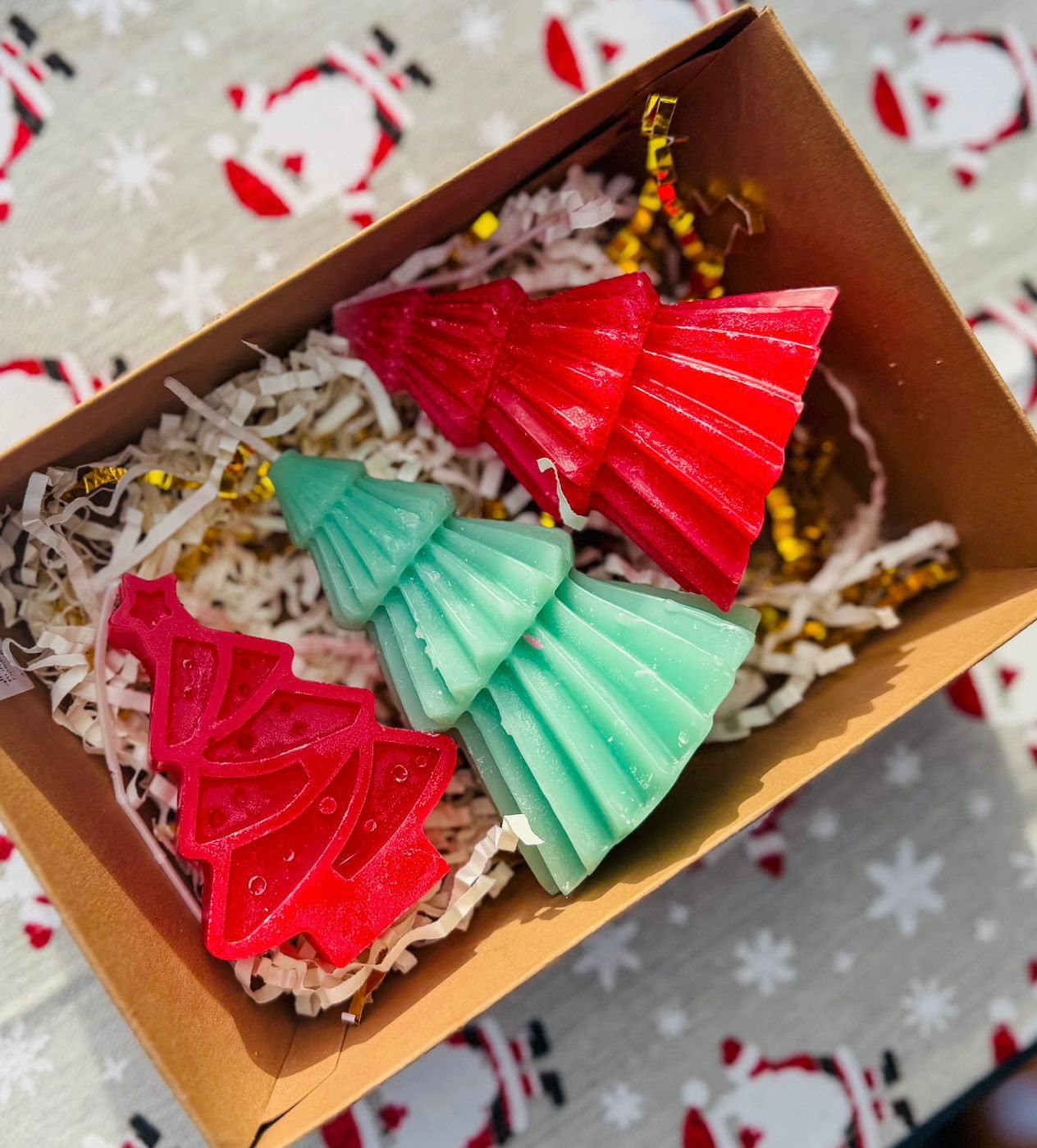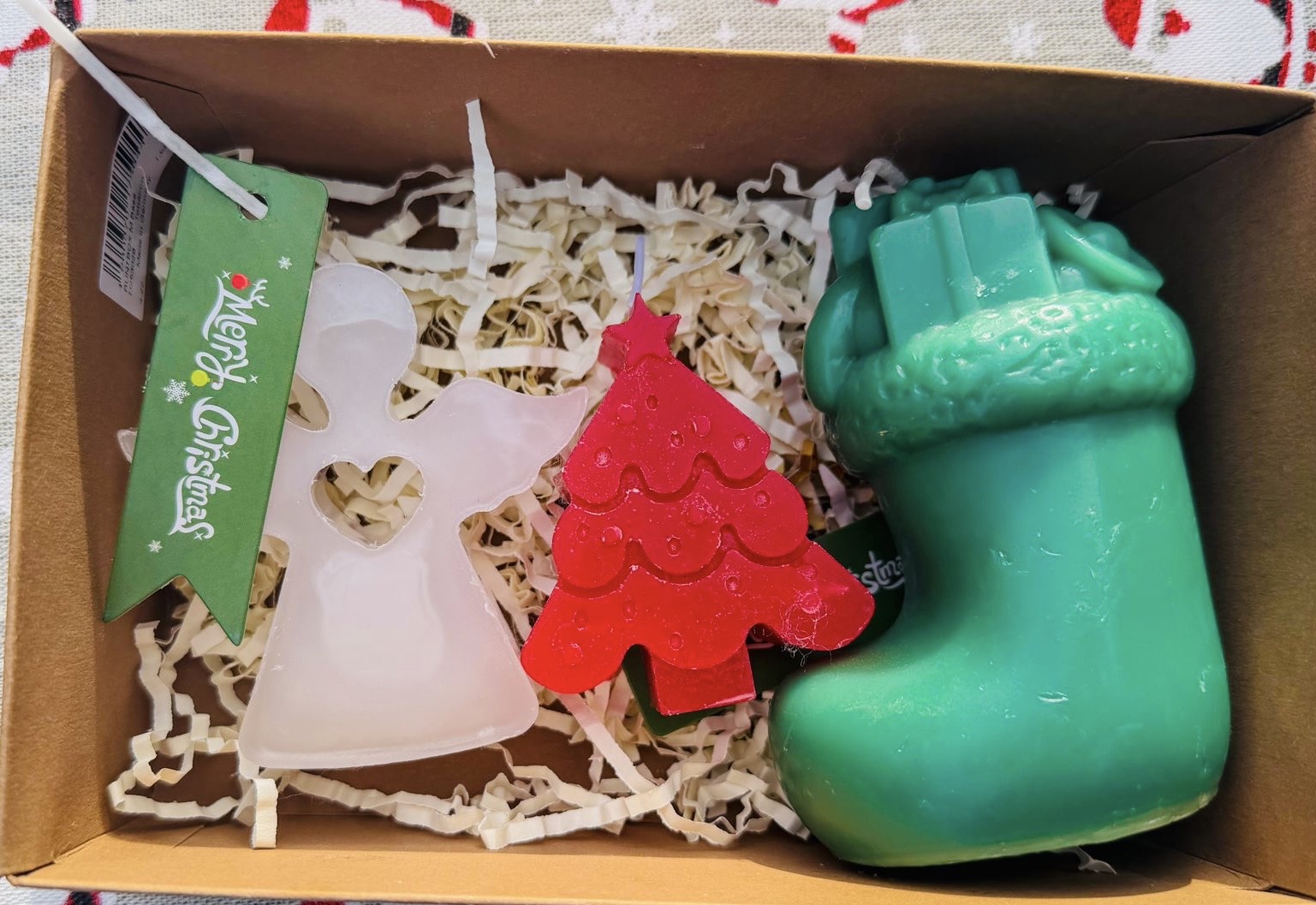 Deze feestelijke cadeauset bestaat uit drie handgemaakte kerstkaarsen: