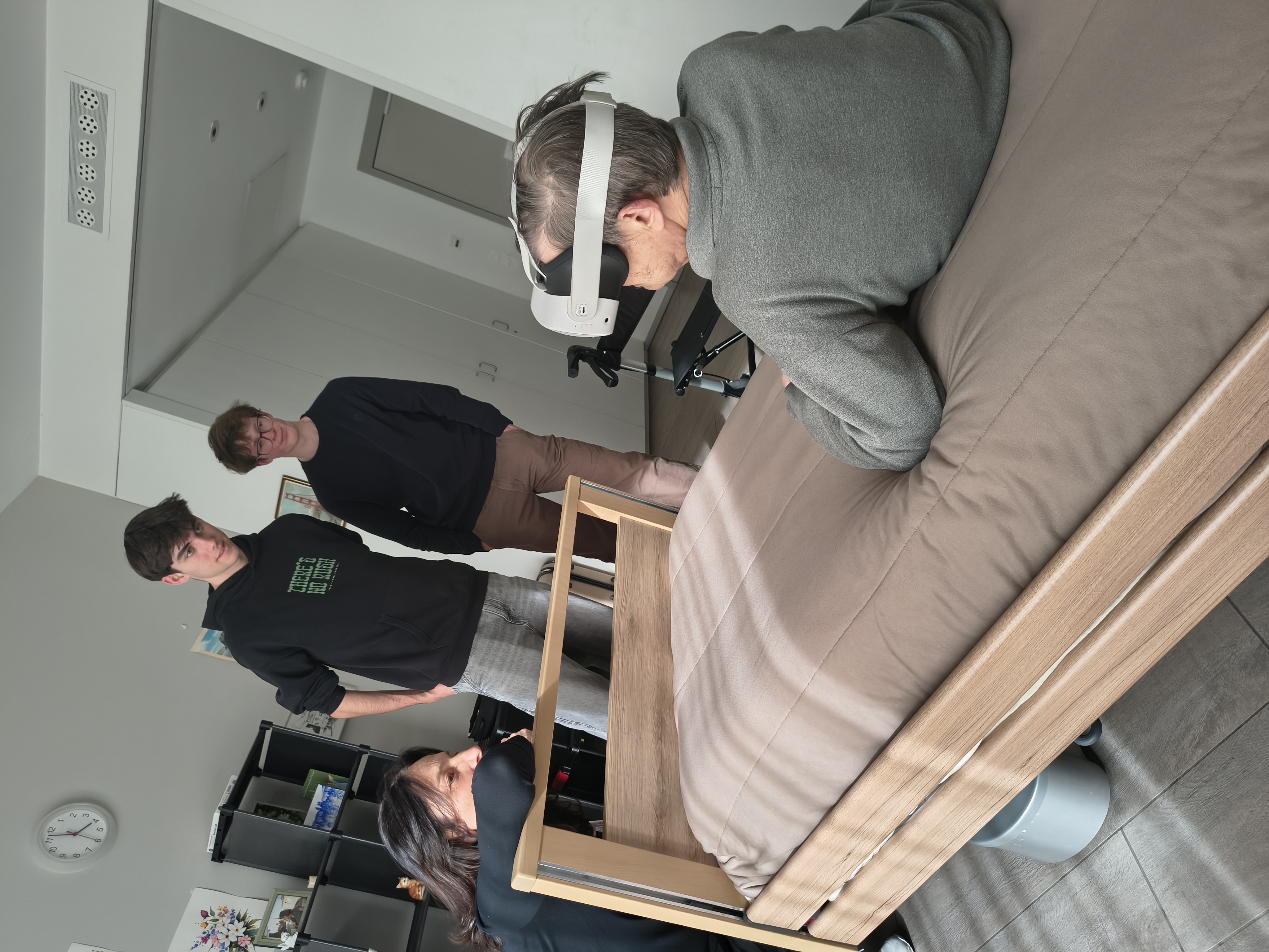 Op woensdag 18 maart zijn Lou, Flor en Talle naar het rusthuis in Heverlee getrokken. Hier hadden we een afspraak verkregen via Woonzorgnet-Icuro Vlaams-Brabant om langs te mogen gaan bij een aantal bewoners. We werden opgewacht door een van de medewerkers, met wie we eerst nog een gesprekje hadden over wat ons product nu concreet was en hoe het werkte. Al snel zijn we bij een aantal bewoners langsgegaan met onze VR-bril. Hierbij hadden ze zelf de optie welke beleving ze het liefst wilden doen. Voor vandaag hadden we voor hen de keuze tussen: een algemene wandeling door Leuven (van het Ladeuzeplein tot de Oude Markt), een wandeling door het Begijnhof of onze nieuwste ervaring, de wandeling doorheen de kruidtuin. We merkten en kregen te horen van de bewoners dat ze verwonderd waren door ons product en dat ze nooit hadden gedacht dat het zo echt kon lijken. Een aantal van de bewoners vond onze beleving zelfs zo leuk dat ze ook de andere wilden ervaren en er daardoor voor kozen om ze alle drie te doen.