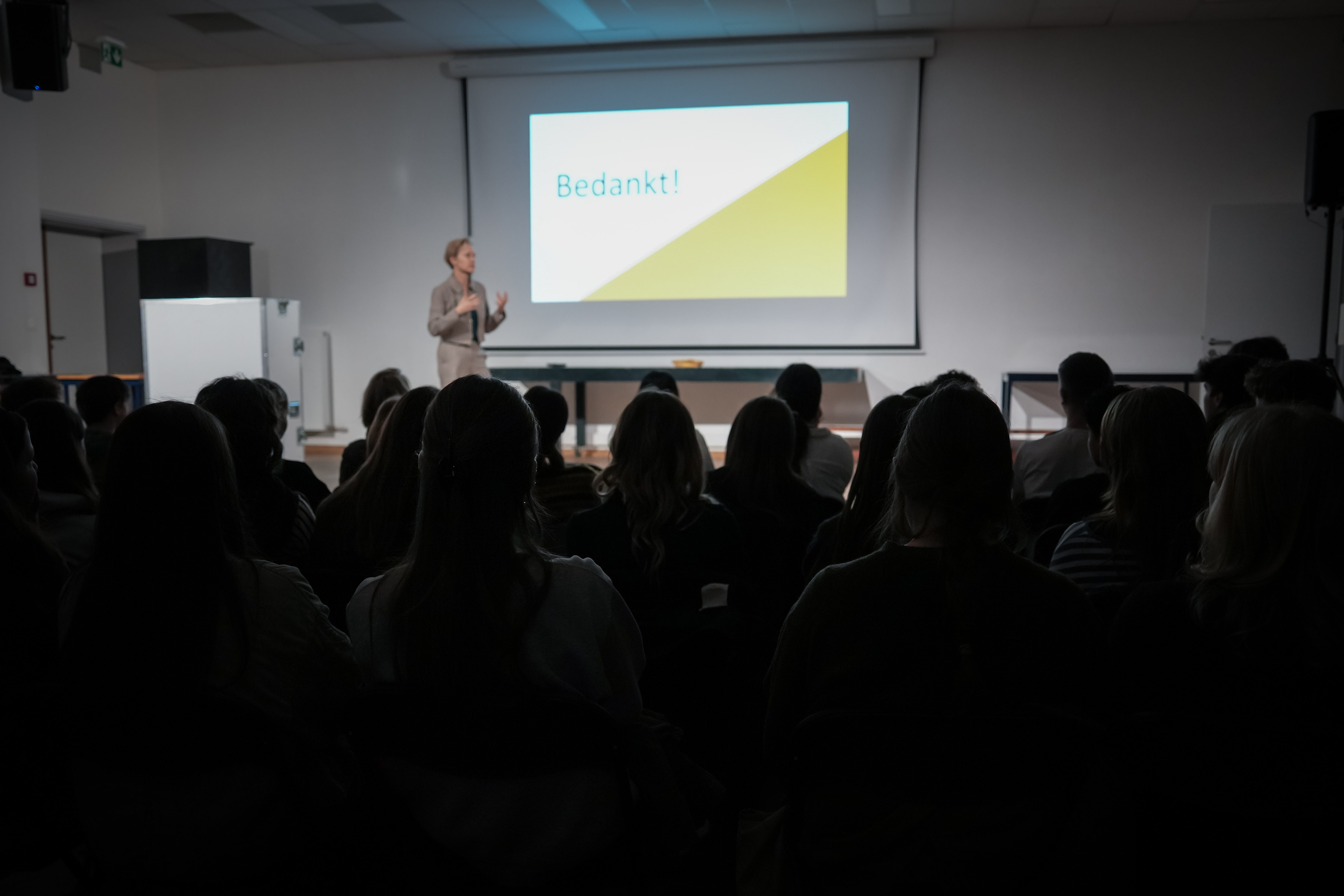 Naast minister De Ridder waren ook vertegenwoordigers van het schoolbestuur Cobra aanwezig op onze school om de WegWijs-presentatie bij te wonen. We mochten daarnaast mevrouw Ait Daoud, schepen van Onderwijs, en talrijke studenten ontvangen, waardoor de zenuwen toch wel flink aanwezig waren.